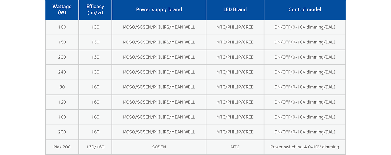 Dali, 0-10V dimming, Sensor & CCT & Wattage switch functions available